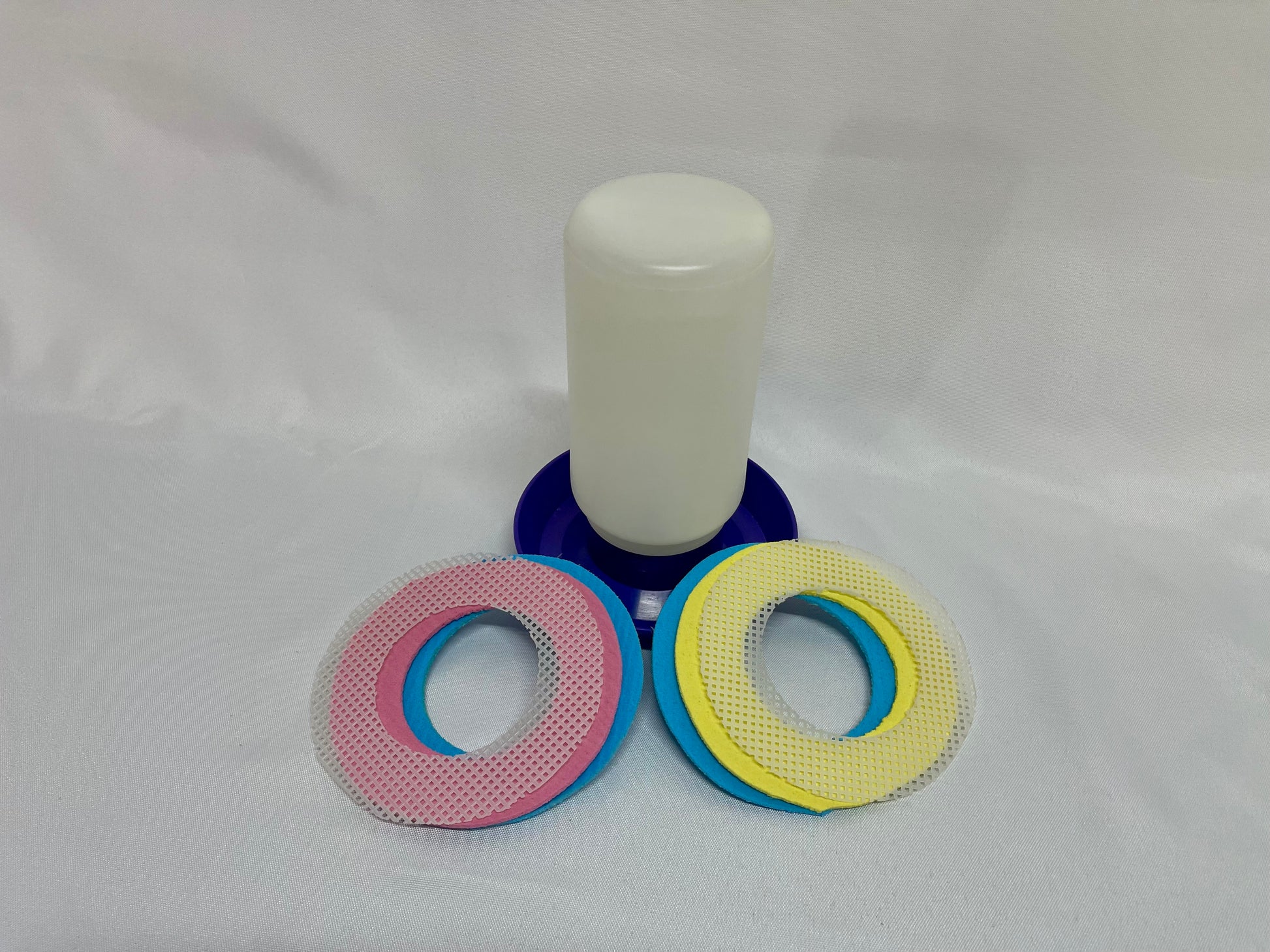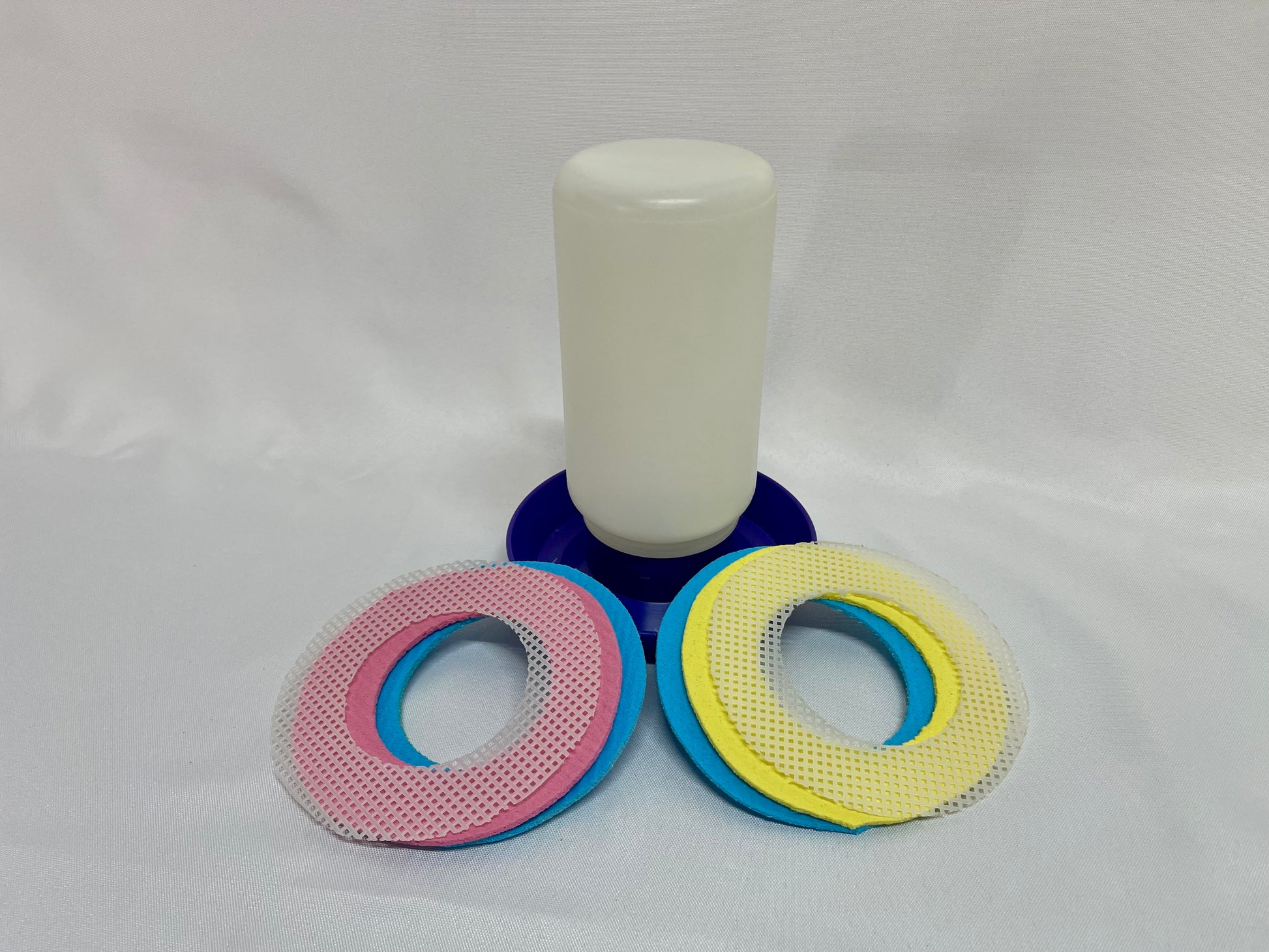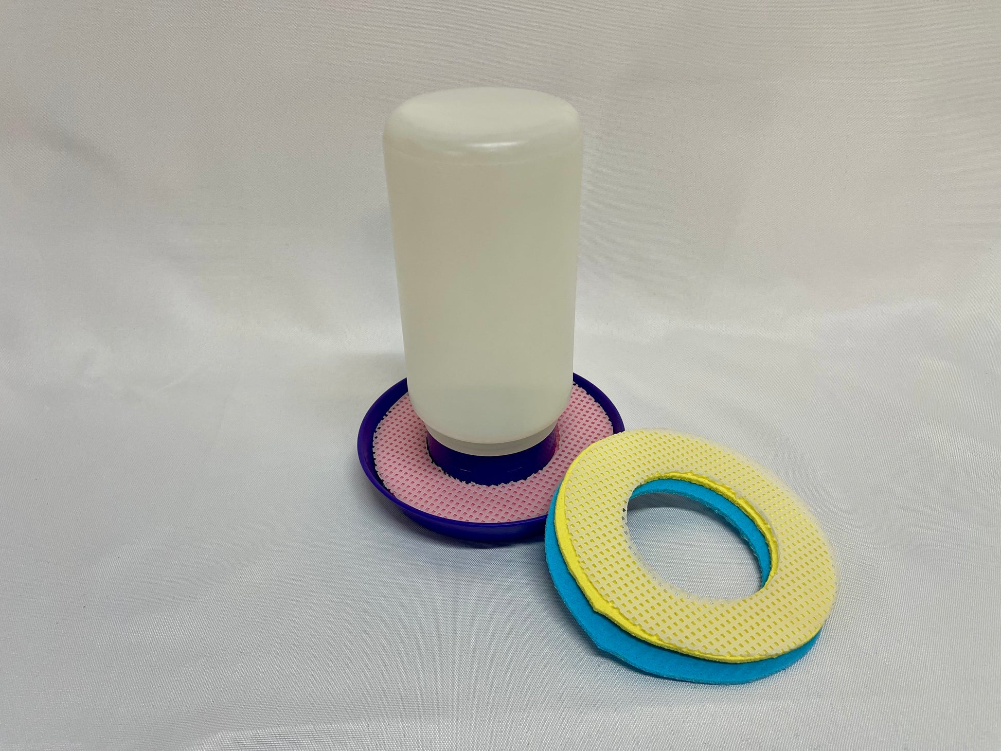 Fill the 1 quart container with water. Moisten 2 of the sponge rings and place in the bottom of the watering tray. Put the mesh ring over the sponge rings.